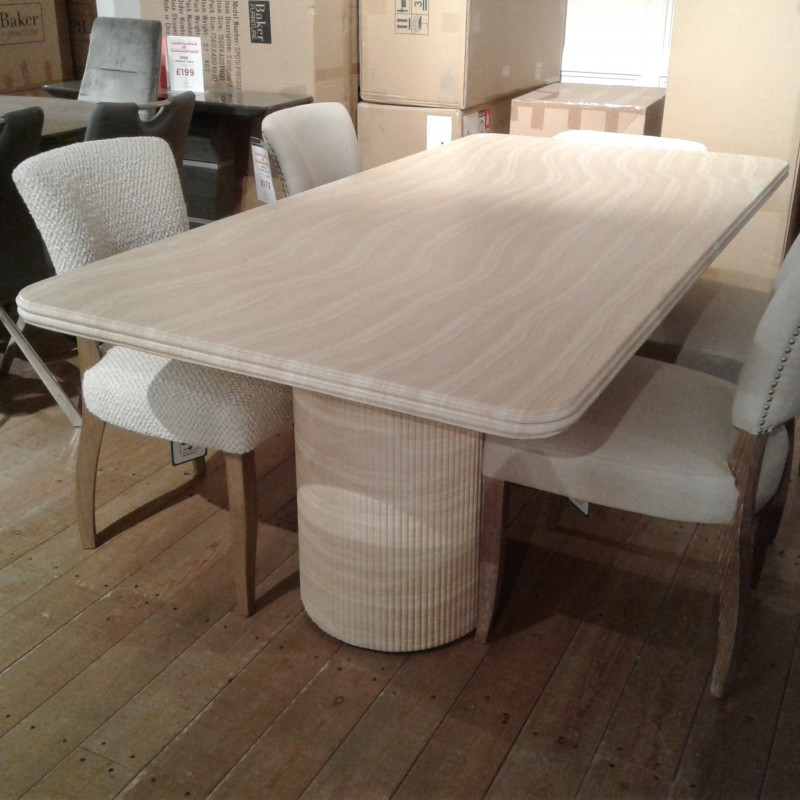 Zira twin pedestal dining table in travertine finish. Very limited quantity available to clear from stock
