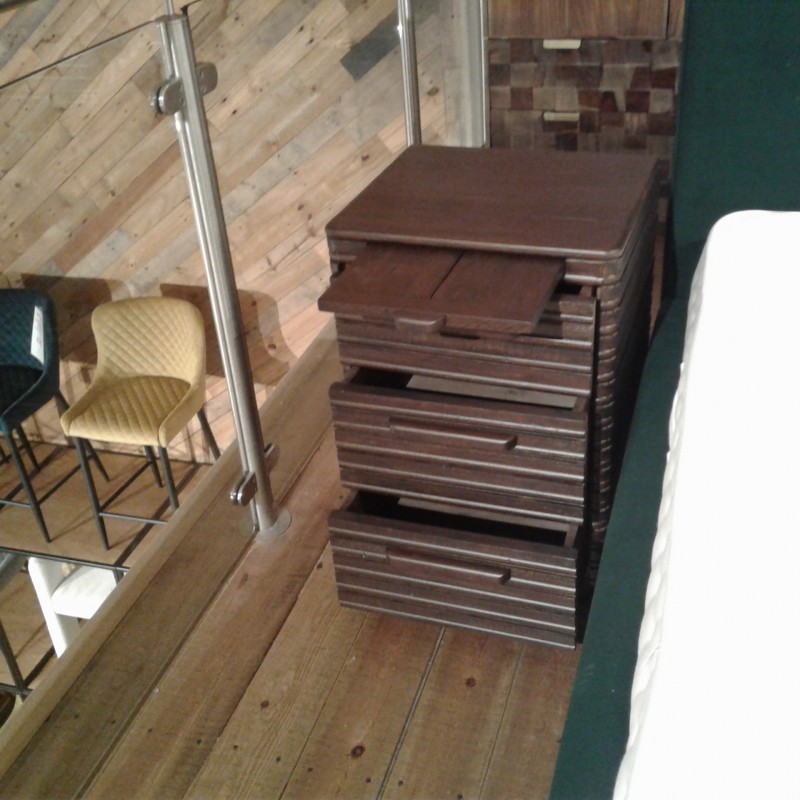 Tova narrow bedside in dark finished reclaimed wood. Last one to clear